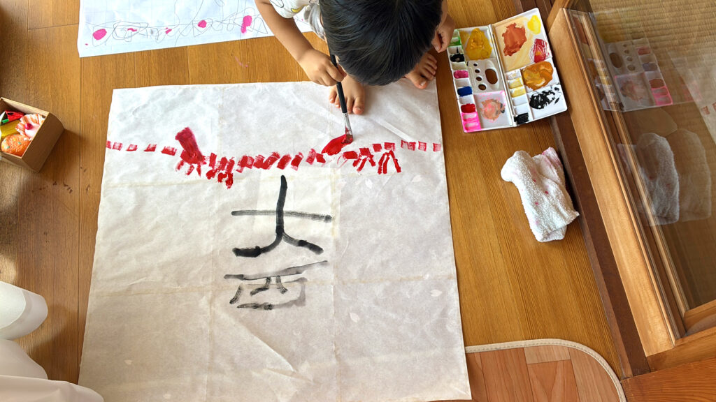 そっと剥がして綺麗に残った紙を乾かして描いていいよーと言ったら「大西」。