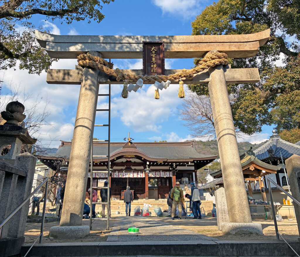 昨年、魚崎児童館でしめ縄作りをさせていただいたとき、あんなに大変だったのにこんなに小さなお飾りなの?と驚いたことを思い出しながら、鳥居や拝殿なんて大きくて太いしめ縄、どうやって作るんだろう?と朝から見学させていただきました。